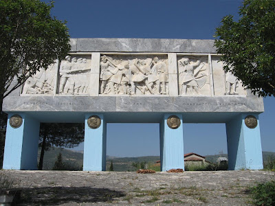 Ioannina is high in the hills so the temperature cools down over night. We slept comfortably and left before the full heat of the day. Nearby at Bizani we stopped at an isolated spot to visit a war memorial to Greek Resistance fighters during WW2. Seeing someone hurriedly approaching and looking rather wild I returned to check we'd locked Modestine's doors. He came up to us, tugging our arms and pointing repeatedly at his hand in which he held a non EU coin. We have decided he was probably a homeless Albanian. He was weathered deep brown, old and thin with clothes that would have looked sad on a scarecrow. Most of his teeth were missing and he had two ends of cigarettes tucked between those that remained. At such a remote place he was unlikely to make much money begging and it seemed such a pitiful existence, particularly under such a relentless sun. We gave him a couple of euros and I was going to find him some water and food in Modestine but he simply snatched the money and ran off without a word.